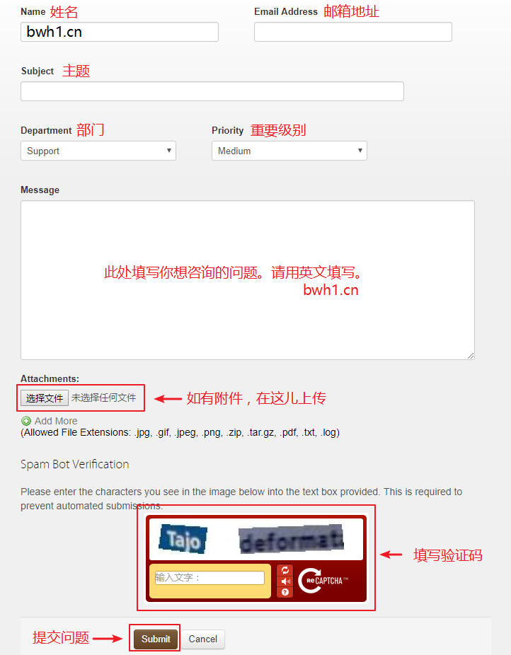 点击后会出现如下页面,需要填写姓名、邮箱地址、主题等相关信息。下面给出了填写指导。
